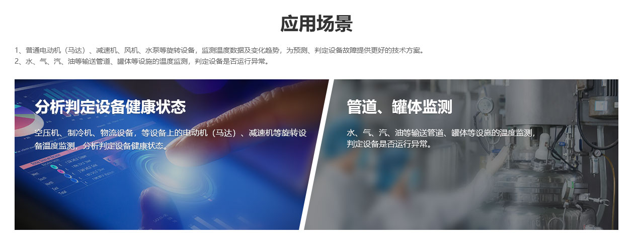 1、普通電動機(馬達)、減速機、風機、水泵等旋轉(zhuǎn)設備,監(jiān)測溫度數(shù)據(jù)及變化趨勢,為預測、判定設備故障提供更好的技術方案。 2、水、氣、汽、油等輸送管道、罐體等設施的溫度監(jiān)測,判定設備是否運行異常。