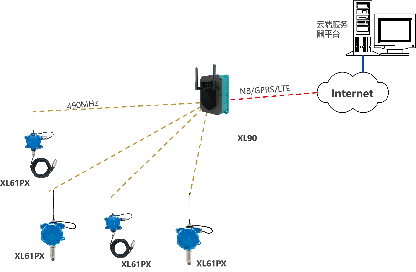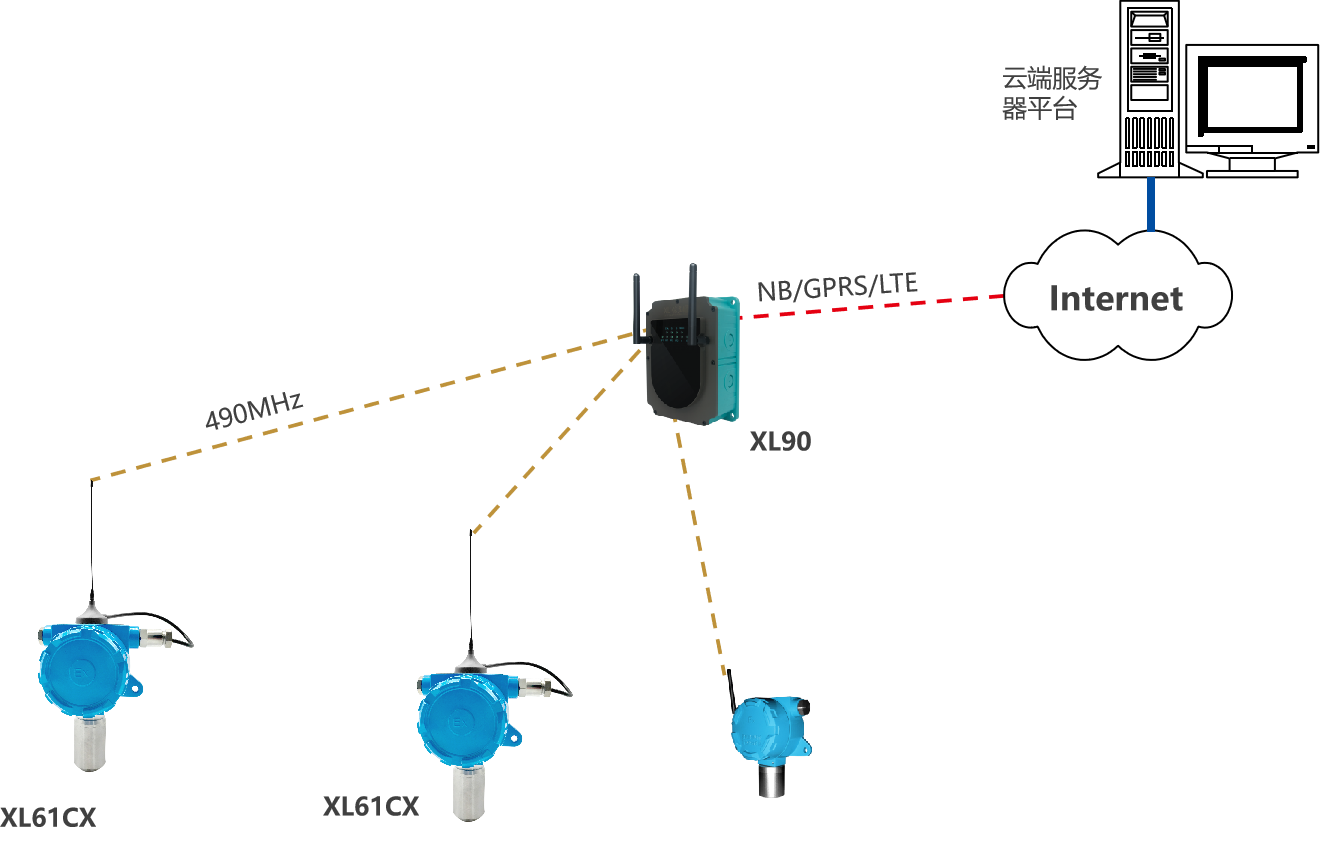 選擇XL90物聯網關,無線讀取監測點的數據,進行協議、通訊轉換后,推送至上層軟件平臺