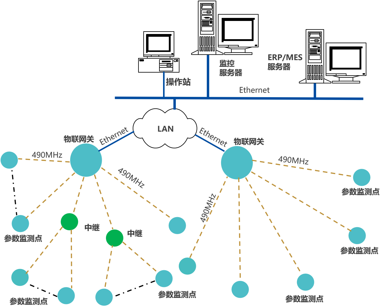 系統(tǒng)網(wǎng)絡(luò)方案一,用于工廠,或規(guī)模較小的園區(qū),水、汽、氣管網(wǎng)監(jiān)測(cè)系統(tǒng)。由監(jiān)測(cè)節(jié)點(diǎn)、網(wǎng)關(guān)和平臺(tái)軟件構(gòu)成