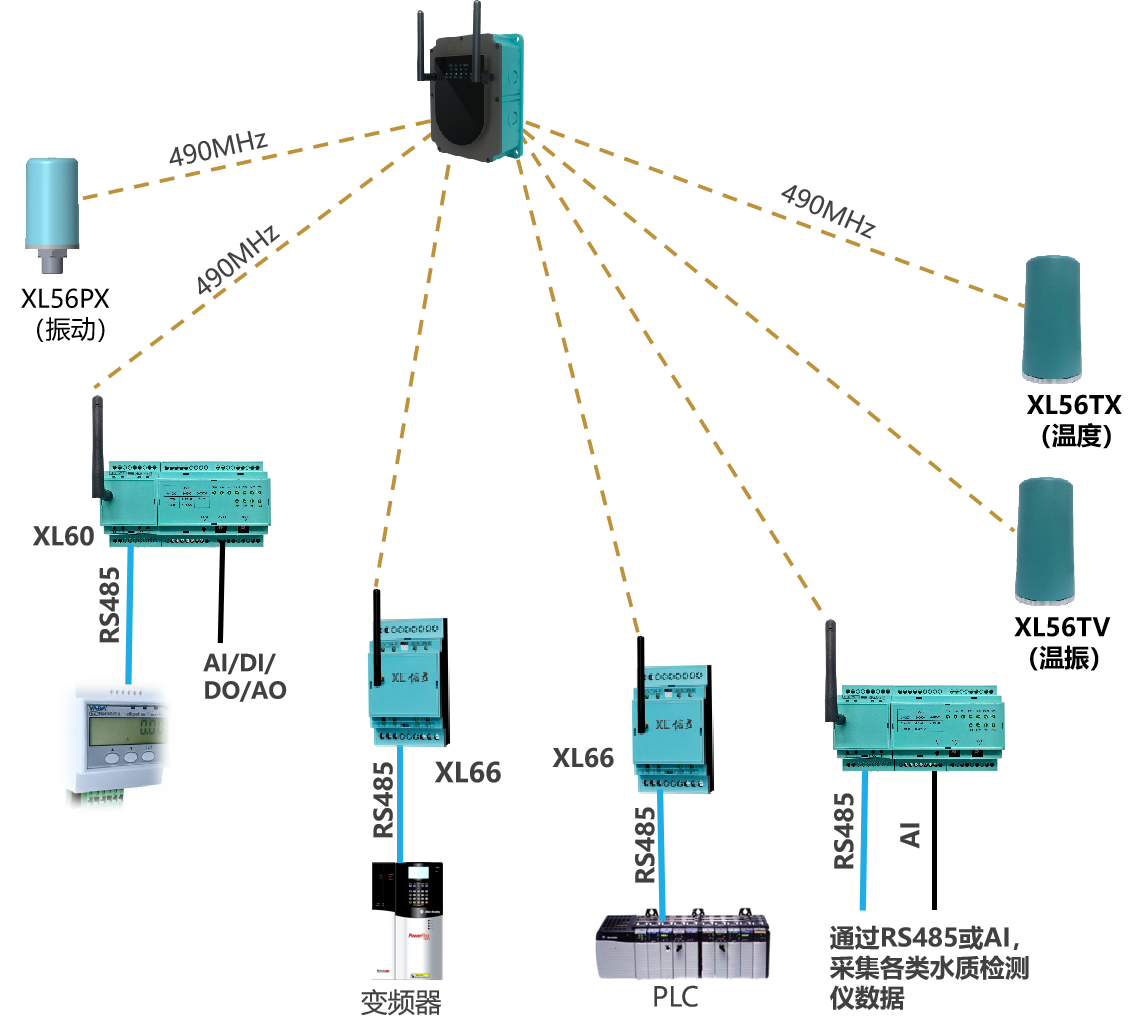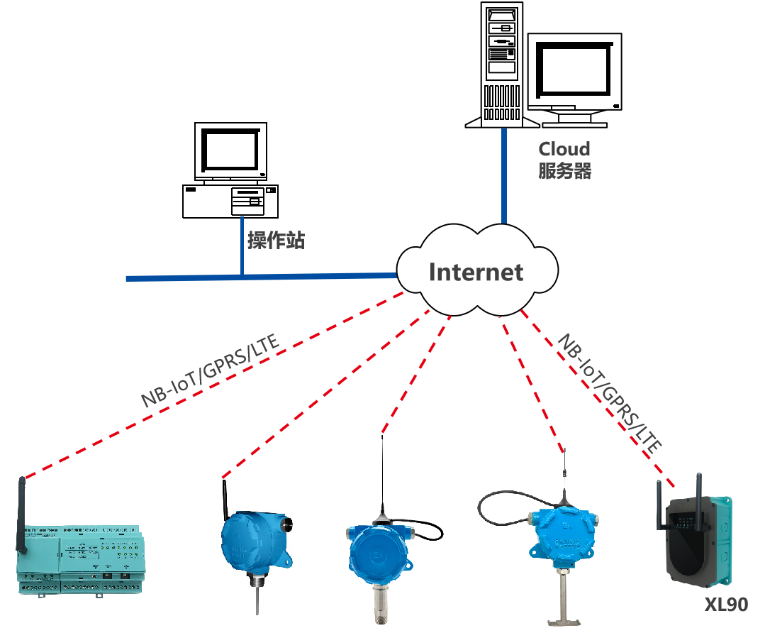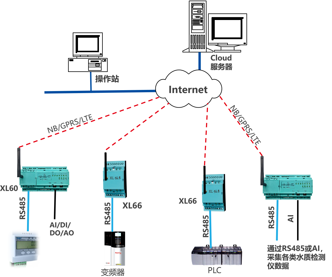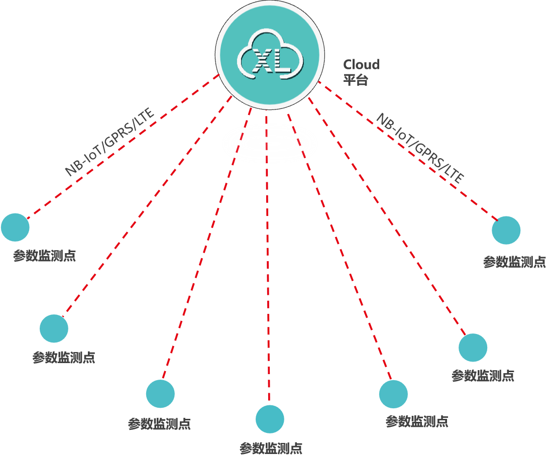 類似泵房、水廠、水源井等場(chǎng)所的數(shù)據(jù)監(jiān)測(cè),監(jiān)測(cè)點(diǎn)的數(shù)據(jù)先上傳至XL90物聯(lián)網(wǎng)關(guān),再通過NB/GPRS/LTE轉(zhuǎn)發(fā)數(shù)據(jù)至云平臺(tái),此種情況,數(shù)以后在量大時(shí),可選LTE(4g)方式