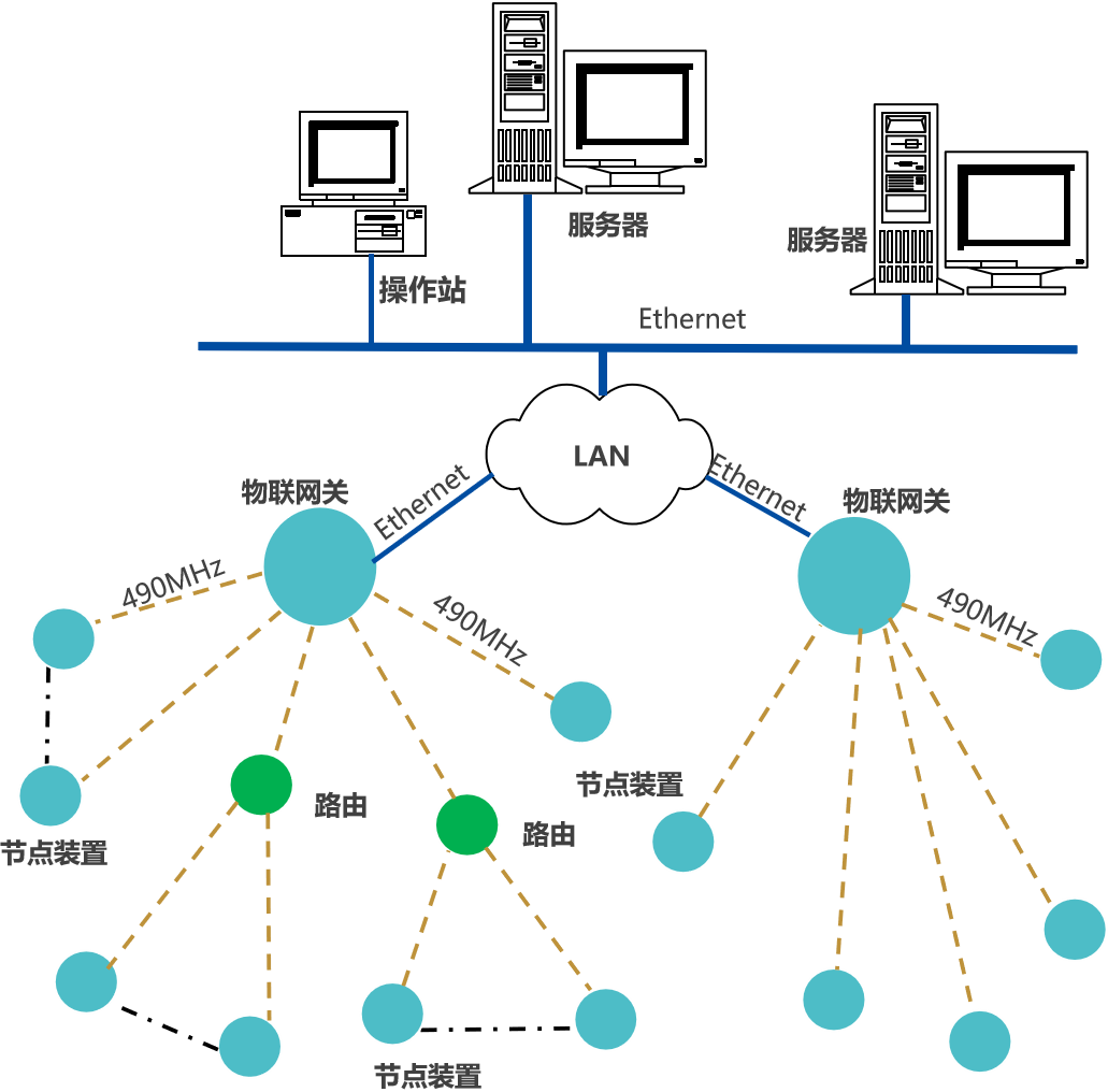 節點裝置(智能轉換器/智能轉換裝置),通過490MHz上傳數據至物聯網關,網關通過Ethernet接入企業內部LAN,推送設備生產數據,至企業生產監控平臺