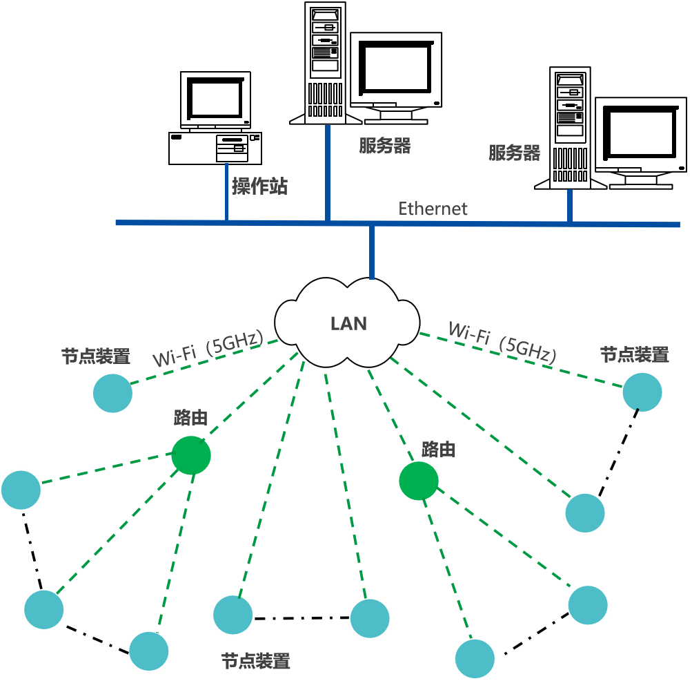 節點裝置(采集點裝置),通過Wi-Fi(5GHz),接入企業內部LAN,推送設備生產數據,至企業生產監控平臺