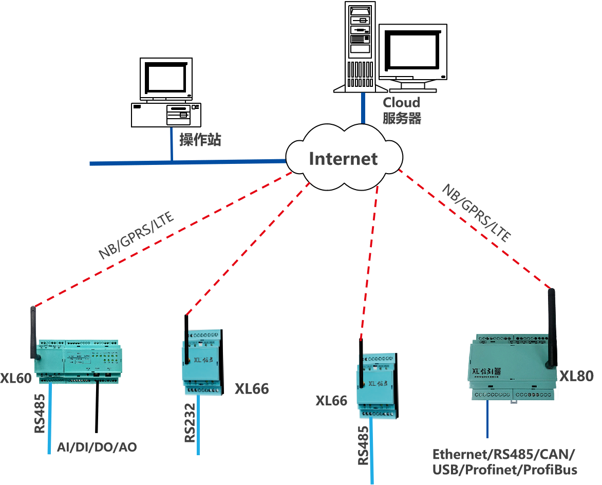 XL80智能主機, Ethernet、CAN、USB、Profibus、 Profinet、RS485等接口,讀取數據,NB/GPRS/LTE通信;推薦LTE
