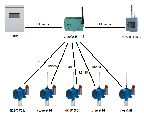 我司廢氣監(jiān)測系統(tǒng),選用XL97網(wǎng)關(guān)終端。通過采用RS485線的方式將各監(jiān)測點的數(shù)據(jù)傳輸至XL80智能主機(jī),智能主機(jī)的一個網(wǎng)口通過ETHERNET方式將數(shù)據(jù)轉(zhuǎn)發(fā)給原有PLC系統(tǒng);另一網(wǎng)口通過ETHERNET方式將數(shù)據(jù)上傳至XL97網(wǎng)關(guān)終端,網(wǎng)關(guān)終端將傳來的數(shù)據(jù)進(jìn)行分析處理后,直觀的將各監(jiān)測點的數(shù)據(jù)實時顯示出來。