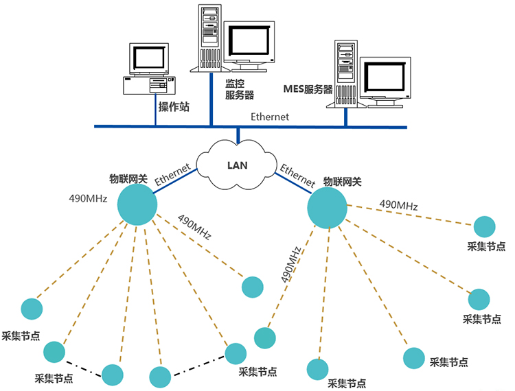 采集節(jié)點(diǎn),通過(guò)490MHz無(wú)線上傳數(shù)據(jù)至物聯(lián)網(wǎng)關(guān),網(wǎng)關(guān)通過(guò)Ethernet,接入LAN,推送數(shù)據(jù)至MES服務(wù)器