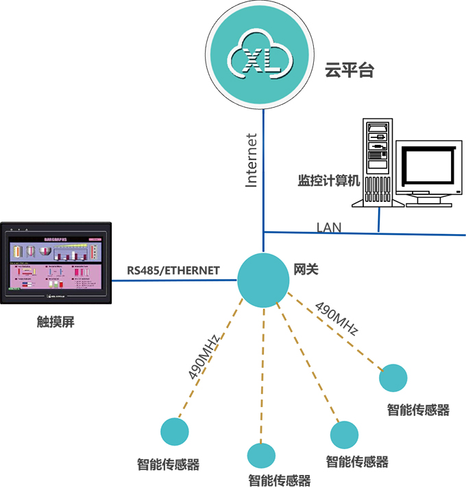 智能傳感器,通過LoRa(490MHz)上傳數據至物聯網關