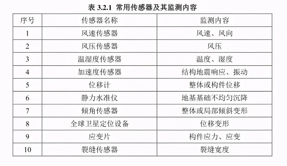 作為結(jié)構(gòu)檢測(cè)最為重要的內(nèi)容,傳感器起到了最為關(guān)鍵的作用。從結(jié)構(gòu)檢測(cè)常用的傳感器類型來看,風(fēng)速傳感器、風(fēng)壓傳感器、溫濕度傳感器、加速度傳感器、位移計(jì)、裂縫傳感器這些都是必備的,常用的傳感器及監(jiān)測(cè)指標(biāo)見下圖。
