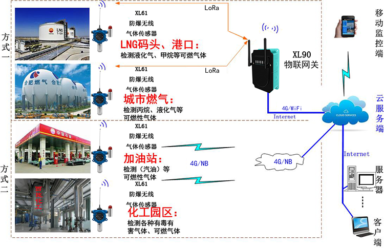 化工園區生產安全監控系統,基于無線傳感器、智能環境監測終端、物聯網關、無線采集裝置、監控服務器和XL.VIEW上位機監控軟件等,實現對園區生產環境的各項要素(如有毒有害氣體、易燃易爆氣體、風向風速、氣壓、雨量、溫濕度、粉塵、煙感等)進行實時采集、無線傳輸、監測與預警。