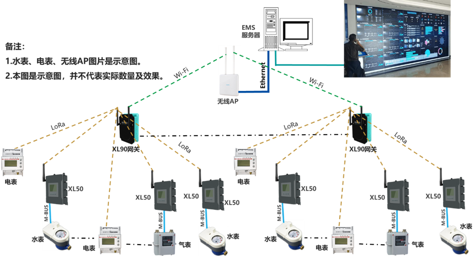 物聯網關通過LoRa無線讀取水、電、氣等表計的數據,通過Wi-Fi推送數據至EMS(能源管理)服務器,無線AP起到橋梁作用。無線AP通過以太網接口,直接聯接EMS服務器。