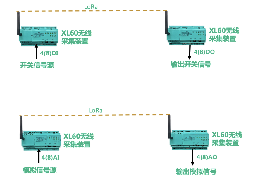 選擇兩臺(tái)XL60無(wú)線采集裝置,以一對(duì)一的無(wú)線傳輸方式,實(shí)現(xiàn)模擬、開(kāi)關(guān)信號(hào)無(wú)線傳輸:一臺(tái)XL60可配置多個(gè)I/O模塊;