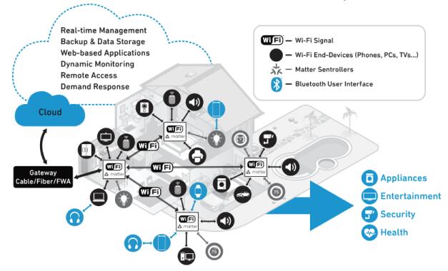 Matter有助于消費類物聯網互聯生態系統輕松實現即插即用,從而簡化智能家居和智能辦公環境。它在互聯網協議之上提供一個層,其中包括一組適用于所有Matter連接設備的預定義方案。這使得 Matter 設備能夠了解它們正在與什么類型的對象進行通信,以及這些對象有什么樣的功能。Matter 使物聯網終端設備或節點能夠與各種 Wi-Fi 網絡 pod 輕松通信。