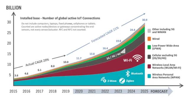 圖2:使用不同技術的物聯網設備的實際和預測數量