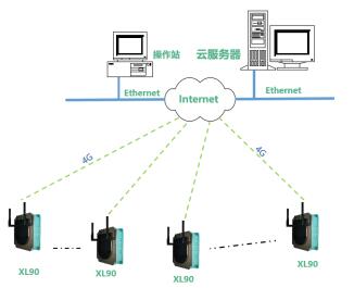對于安裝分散、距離遠的監測點,可通過XL90網關構建一個小的物聯網數據采集系統。網關無線讀取區域內各監測點的數據,通過4G推送數據至云平臺。