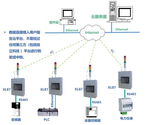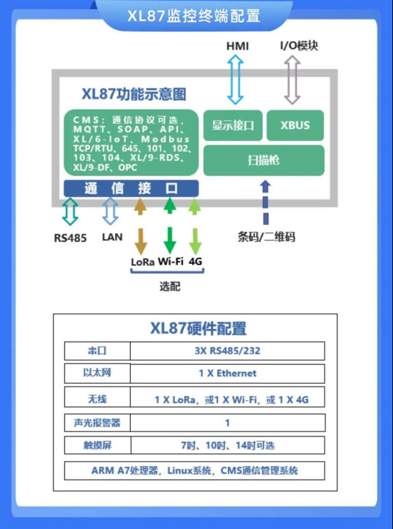 XL87監控終端,以一套生產設備、一條產線、或是多臺相關聯的機器設備作為一個監測對象,可實現設備數據采集、運行狀態監測、物料追溯、設備信息讀取、機器啟停控制等功能。