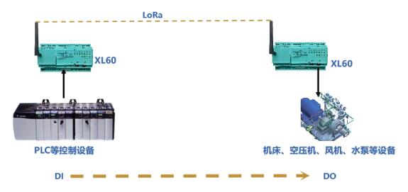 一對(duì) XL60 無線采集裝置 ,一臺(tái)與 PLC 等控制儀表連接,作信號(hào)發(fā)射端;一臺(tái)配置在生產(chǎn)現(xiàn)場(chǎng),作信號(hào)接收端。發(fā)射端的 XL60 將控制儀表的啟停命令,通過 LoRa 無線對(duì)傳到接收端,接收端的 XL60 輸出開關(guān)量信號(hào),控制設(shè)備啟、停。