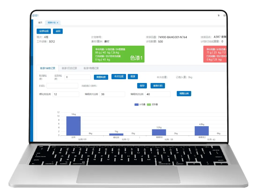 系統(tǒng)指導(dǎo)操作員按照標(biāo)準(zhǔn)工藝流程進(jìn)行調(diào)和,實(shí)時(shí)監(jiān)控調(diào)漆過(guò)程以防止錯(cuò)誤操作。