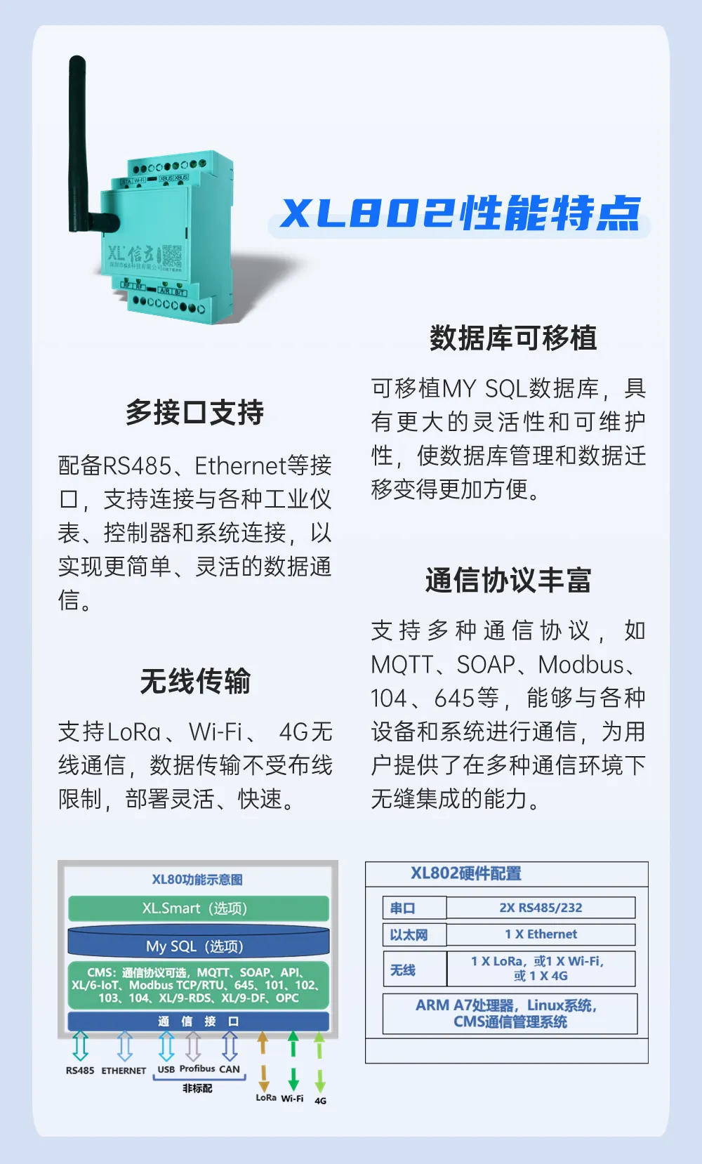 XL802通信主機對采集的數(shù)據(jù)進行處理、協(xié)議轉(zhuǎn)換,通過Ethernet、Wi-Fi或4G通信方式,將數(shù)據(jù)傳輸至監(jiān)控平臺。