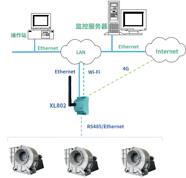 選擇XL802通信主機,接入離心風機的PLC,實時采集設備風量、風壓、轉(zhuǎn)速、功率等運行參數(shù)。
