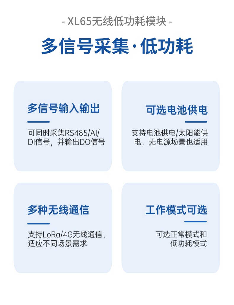 XL65 無線低功耗模塊支持LoRa、4G無線通信方式,可根據(jù)實際應(yīng)用場景和需求,選擇合適的無線通信方式,將采集到的信號和數(shù)據(jù)上傳至監(jiān)控中心。