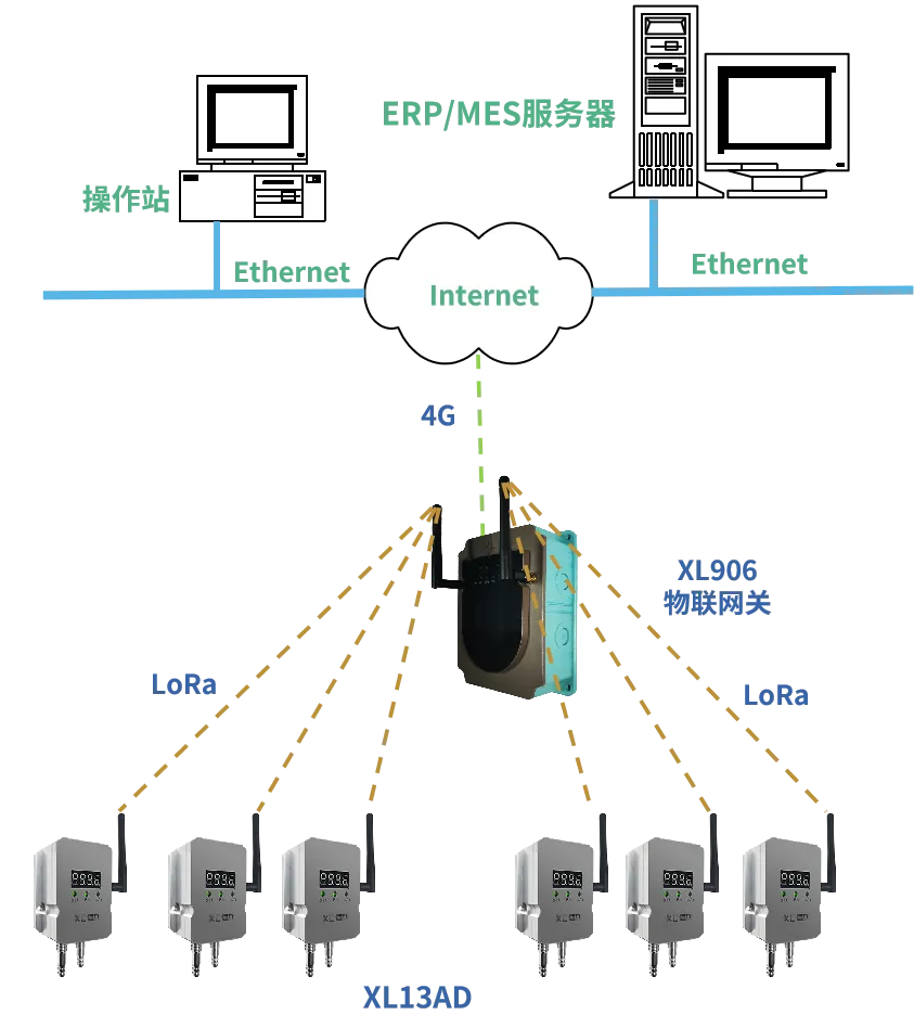 為規(guī)避布線破壞潔凈室氣密性,方案采用無線組網(wǎng)方式,XL13AD無線壓差傳感器通過LoRa無線傳輸壓差數(shù)據(jù)至XL90物聯(lián)網(wǎng)關(guān),物聯(lián)網(wǎng)關(guān)通過4G傳輸數(shù)據(jù)至云平臺。